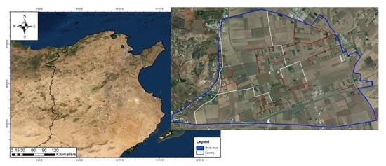 Cherfech, an irrigated district located within the Basse Vallee de Medjerda, near the town of Cherfech (Lat. 36°57′ N, Lon. 10°02′ E, and elevation 8 m) in the north of Tunisia, was chosen as the focus of this research (Figure 2). This area was selected for the establishment of an IAS due to the diversity of its crops cultivated, including cereals, forages, winter vegetables, and fruit trees. The area also includes different irrigation systems such as surface, drip, and sprinkler. This irrigated district covers 2022 ha and is subdivided into 22 hydraulic sectors serving 127 farms of variable sizes. The irrigated district of Cherfech belongs to the upper semi-arid zone and is characterized by an average precipitation of 509 mm/year, which is unevenly distributed over time with peaks in winter and spring. The annual ETo is about 1552 mm, with the highest monthly value of the ETo reached during July (177 mm) and the lowest value (29 mm) obtained in December.