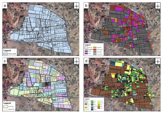 To adequately depict the irrigation district of Cherfech at the WUA level and facilitate information transfer, a geographic information system (GIS) database was created to collect data concerning the irrigated districts’ limits, farm and plot limits, water network transfer, land use, and irrigation systems. This information comes from different sources and formats (maps, plans, and tables in paper and digitized format) and is composed of varying layers that can be integrated and used for the creation of thematic maps. As a result, thematic maps of farm and plot limits, land use during the 2019/2020 growing season, and used irrigation systems were created. Figure 3 represents four thematic maps of the irrigated district of Cherfech: (a) the farm limits; (b) the irrigation system used; (c) the limits of the irrigation units; and (d) the land used during the growing season.