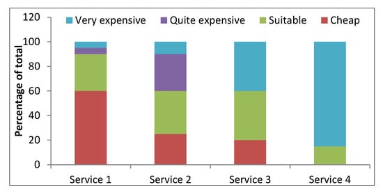 The price for each service (detailed in the Methodology section) was presented to the farmers, in order to understand whether they perceived it to be good value. The proposed monthly prices were 5 Tunisian dinar (TND) for service 1, 8 TND for service 2, 18 TND for service 3, and 40 TND for service 4, all as a monthly rate. For each price, the farmers had to choose between four possible answers: cheap, suitable, quite expensive, and very expensive. The price range for each service was then determined following farmers’ feedback. Figure 4 shows the different services, their prices, and perceptions of these among farmers. The highest service price (for service 4) was perceived by farmers as very expensive.