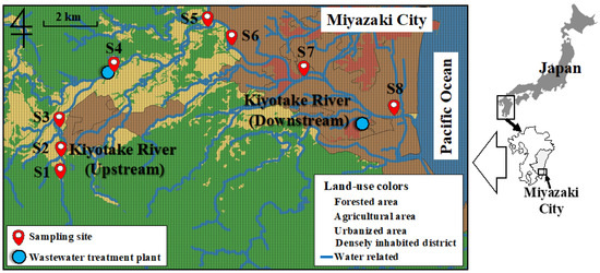 Water samples were collected from the Kiyotake River, a 28.8 km-long river that flows in the forest, agricultural areas, and urbanized areas in Miyazaki, Japan (Figure 1) on 12 November 2017, and 18 September 2018. Eight sampling sites (S1–S8) were established along the river. Site S1 is the uppermost stream of the river, and the catchment area mostly covers forests. Sites S2 to S5 are adjacent to forest or agricultural forest areas. There is a local community (population 11,000) between sites S3 and S4. Sites S6 to S8 pass through the urban areas in Miyazaki City. In addition, there are two sewage treatment plants: one between S3 and S4 and the other between S7 and S8. Based on the land use patterns, eight sampling sites were divided into three groups (upper, middle, and lower regions). The S1, S4, and S8 sites were selected as the representatives of each group. A total of 20 samples were collected from the eight sites. At Site S1, three samples were collected per sampling event to analyze the variation due to water sampling at the same site. One sample was collected per sampling event at each of the other sites.