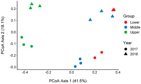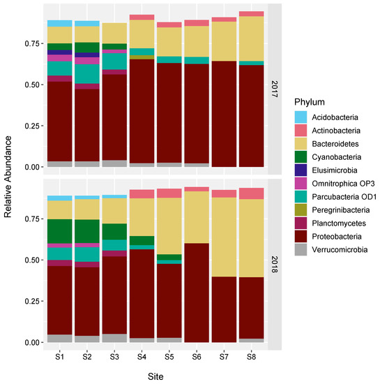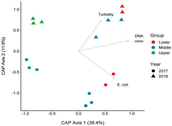 Bacterial community structures were assessed by the 16S rRNA gene-sequencing analysis. A total of 471,244 reads (21,044–57,981 and 19,562–26,749 per sample in 2017 and 2018, respectively) were clustered into OTUs and used for taxonomic assignment. The phyla Proteobacteria and Bacteroidetes predominated the bacterial communities at all sites (Figure 2), although the relative abundance of Bacteroidetes was larger in the lower and middle sites (S4–S8) than in the upper sites (S1–S3) (p < 0.01 by the Kruskal–Wallis test). In both 2017 and 2018, the phyla Acidobacteria, Planctomycetes, and OP3 were only detected in the upper sites (S1–S3), whereas Actinobacteria were only detected in the middle (S4–S6) and lower sites (S7 and S8). Similarly, Cyanobacteria were only detected in the upper and middle sites. Parcubacteria (also kwon as OD1) were detected in all regions (i.e., upper, middle, and lower sites), but their relative abundance was larger in the upper sites than in the middle and lower sites (p < 0.05 by the Kruskal–Wallis test). This shift may reflect the change in the land use of the river catchment from forest to the agricultural and urban environment [28]. Change in the river bacterial community structures was also shown by the PCoA (Figure 3). The difference in the bacterial community structures by site (group) and year was supported by the PERMANOVA (p < 0.05). The CAP analysis showed that the DNA concentration, turbidity, and E. coli levels were strongly associated with the patterns in microbial communities (Figure 4). As discussed above, DNA concentrations and the levels of E. coli might have been influenced by the effluent from the sewage treatment plants located between the S3 and S4 sites and upstream of the S8 site. Therefore, the changes in the bacterial community structures along the river were at least in part influenced by the sewage effluent.