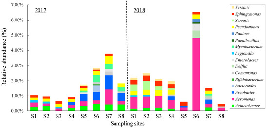 The influence of sewage-treatment effluent raises a concern about the presence of potentially pathogenic bacteria. Therefore, we extracted the genera that contain potential human pathogens from our OTU data, based on the list of 145 pathogenic bacterial genera presented by Fang et al. (2018) [29]. A total of 87 and 73 potentially pathogenic genera were detected in 2017 and 2018, respectively (Figure S3). They accounted for 1.36–4.52% and 1.15–6.97% of the total bacterial populations detected in 2017 and 2018, respectively. Among those, 16 genera occupied a relatively large fraction (>0.1%) of the population (Figure 5). Acinetobacter, Aeromonas, Pseudomonas, and Sphingomonas were frequently detected across the sites in both 2017 and 2018. In particular, Aeromonas was detected most frequently (4.83% of the population) at the S6 site in 2018. Although Acinetobacter and Aeromonas are not frequently detected in human feces, they are abundant in sewage, soil, and surface water [30,31,32]. Therefore, the potential sources of these bacteria in the river water studied might include sewage and soil. Similarly, Pseudomonas spp. are ubiquitous in various environments including soil, water, and humans [33]. Pseudomonas spp. in the Kiyotake River may originate from these sources. Our previous study also detected P. aeruginosa in various locations along the Kiyotake River, with the concentration ranging from 2 to 25 CFUs per 100 mL [34]. Similar to this study, Sphingomonas has been detected in various water environments such as freshwater [35] and natural mineral water [36]. Legionella was only detected in the upstream sites. Since Legionella is widely distributed in natural environments such as moist soil [37], the potential source of this bacterium would be soil or sediment in the catchment. On the other hand, Arcobacter was frequently detected in the downstream sites. The detection of Arcobacter may be related to the discharge of sewage effluent, because Arcobacter is one of the major genera found in sewage [38]. The influence of human activities such as sewage effluent is also supported by the high levels of E. coli found in the downstream sites. Although these 16 genera were consistently detected both in the 2017 and 2018 samples, their relative abundances to the total population were variable between the two years, probably because of the differences in environmental conditions such as temperature and precipitation. Future research is needed to clarify the factors influencing their abundance. It is also important to note that these data show relative abundances. The absolute abundances of these genera (i.e., copies of bacteria per L water) may be different. For example, the relative abundances of potentially pathogenic genera were relatively low in the S8 site, but these samples had the highest DNA concentration, which means they had the highest biomass. Therefore, the absolute abundances of these genera in the S8 site may be larger than in the other sites.
