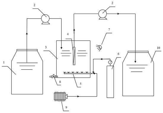 A schematic diagram of the pilot-scale MPBR system. (1)-Primary tank; (2)-peristaltic pumps, (3)-MPBR vessel, (4)-MBR membrane, (5)-air distributor, (6)-CO2 gas cylinder, (7)-LED lamps, (8)-discharge valve, (9)-Air compressor, (10)-Discharge collector.