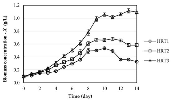 The growth characteristic of C. vulgaris in the MPBR tank with 50% diluted piggery wastewater under three different hydraulic retention times was investigated. The growth profile of the C. vulgaris in 14 days is presented in Figure 2. It can be observed that the biomass concentration grew from around 0.1 g/L to 0.326 ± 0.016 g/L, 0.582 ± 0.019 g/L, and 1.095 ± 0.033 g/L after 14 days at HRT1, HRT2, and HRT3, respectively. The HRT1, HRT2, and HRT3 are corresponding to the hydraulic retention time of 1.25 days, 2.5 days, and 5 days (equivalent to the liquid flow rate of 28, 14, and 7 mL/min). The exponential growth was rapidly achieved after 2 days of lag phase at HRT3 of 5 days. It is noted that the cultivating conditions of all the experiments were under a mixotrophic condition, in which the CO2 supply was maintained at 60 mL/min. The growth of C. vulgaris was found to be at a comparable state with the previous cultivation of C. vulgaris in batch mode in artificial wastewater and 10% swine mixed with BG11 (from 0.4 to 3.16 g/L within 2–12 days) [1,3] (Table 2). The difference between continuous-flow cultivation and batch cultivation is the liquid medium is continuously fed to the microalgae culture. The continuous injection ensured the maintenance of sufficient nutrients presented to the microalgae but posed a risk of algae wash-out at the outlet of the system. However, the result of increasing biomass over time proved that the submerged membrane could effectively be equipped to avoid the wash-out of biomass. These results indicated that the growth rate of microalgae in batch mode could be repeated in the continuous flow system with a similar HRT.