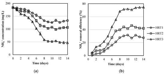 The change of (a) NH4+ concentration and (b) NH4+ removal efficiency in 2-fold diluted piggery wastewater over 14 days in Chlorella vulgaris-based MPBR at various hydraulic retention times (HRT1 = 1.25 days, HRT2 = 2.5 days, HRT 3 = 5 days).
