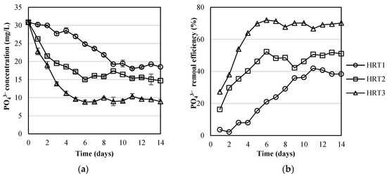 The change of (a) PO43− concentration and (b) PO43− removal efficiency in 2-fold diluted piggery wastewater over 14 days in Chlorella vulgaris-based MPBR at various hydraulic retention times (HRT1 = 1.25 days, HRT2 = 2.5 days, HRT 3 = 5 days).