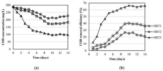 The change of (a) COD concentration and (b) COD removal efficiency in 2-fold diluted piggery wastewater over 14 days in Chlorella vulgaris-based MPBR at various hydraulic retention times (HRT1 = 1.25 days, HRT2 = 2.5 days, HRT 3 = 5 days).