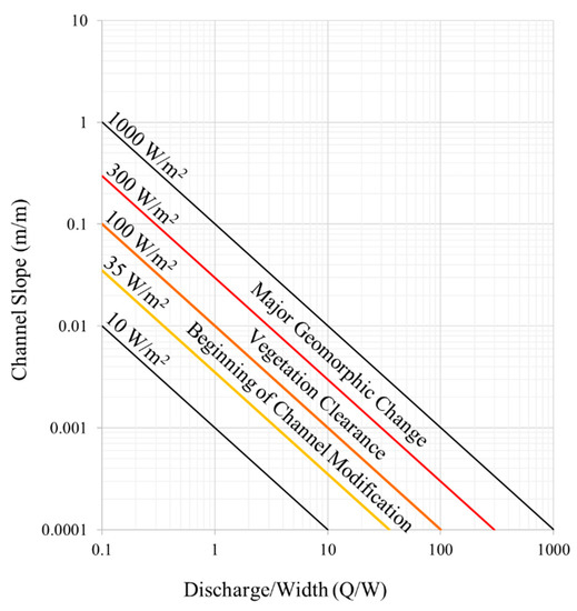 Even though the exceedance of the 300 W/m2 threshold cannot assure geomorphic instability, it can be tied to the initiation of major geomorphic changes [19]. Furthermore, the stream power thresholds for the initiation of channel erosion as proposed in the work of [13,22,23] all fell within the range of 30 to 35 W/m2 despite the former being conducted on a coarse-bedded channel whereas the latter two on a fine bedded channel.