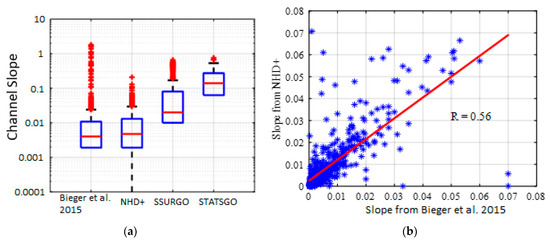 Comparison of slope (a) between the four sources (red dots indicate outliers and blue boxes are range of data with 25th and 75th percentiles), and (b) between NHD+ and Bieger et al. [33].