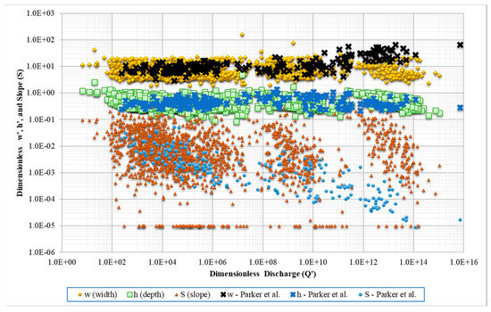 Dimensionless bankfull width, dimensionless bankfull depth, and channel slope plotted as a function of dimensionless bankfull discharge. Bankfull discharge estimated using Simon et al. [46] were overlaid with data points provided by Parker et al. [48].