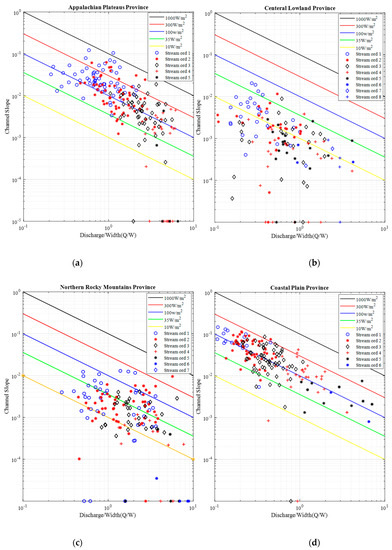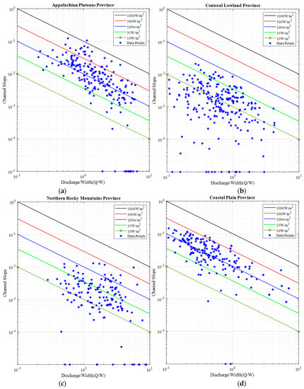 The Appalachian Plateaus (Figure 5a) was found to be dominated by streams that have high power as compared to the remaining three regions. The stream power in this province ranged from 0.19 to 1169 W/m2. Ten percent of the data (23 points) were positioned above 300 W/m2, with the remaining majority laying within the range of 100 to 300 W/m2. Streams in this region are characterized by steeper slopes and narrower channels with bed material mainly composed of sand and gravel [8]. This is consistent with the range of channel slopes and widths compiled for this Physiographic region. The Central Lowland (Figure 5b), compared to the other three provinces, experienced a lower stream power that ranged from 0.023 to 261 W/m2 excluding outlying points, with a majority of the data points falling below the 10 W/m2 power line. The region has the highest width range accompanied by milder slopes and high bankfull discharges. Similarly, the Northern Rocky Mountain province (Figure 5c), the course grain bedded and steep-sloped mountainous streams [8], possessed streams with power ranging from 0.08 to 700 W/m2. Streams in the Coastal Plain province (Figure 5d) exhibited a stream power that ranged from 0.05 W/m2 to 533.33 W/m2. For this region, characterized by gently sloped streams [8,49], more than 90 percent of the data points fell below the 300 W/m2 stream power threshold line despite large discharge ranges. This agrees with MacBroom et al. [16], who pointed out the decrement possibility of stream power in areas with higher discharge but with a decreasing slope downstream.