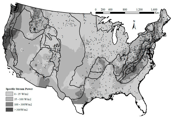 Map of interpolated “available stream power” over the contiguous U.S. The map was prepared using the log values of stream power computed for 1829 points. Black dots on the map indicate the locations of the actual D50 data.