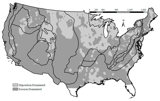 Figure 7 presents the interpolated map showing areas with the corresponding degradation/aggradation channel processes. The logarithmic values were once again used for the map development process. As can be inferred from the map, much of the U.S. is classified as being predisposed to erosion. The Wyoming Basin, part of Grate Plain, and Central Lowland were among the provinces where deposition is seen to be dominant.