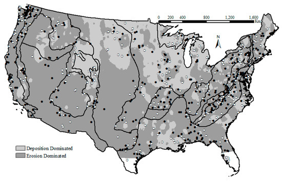 Spatial map showing dominant channel processes over the contiguous U.S. overlaid with points obtained from [36] for aggradation/degradation pattern. Black dots indicate gaging sites where both sources agree for the erosion/deposition pattern; the converse is true for the white dots.