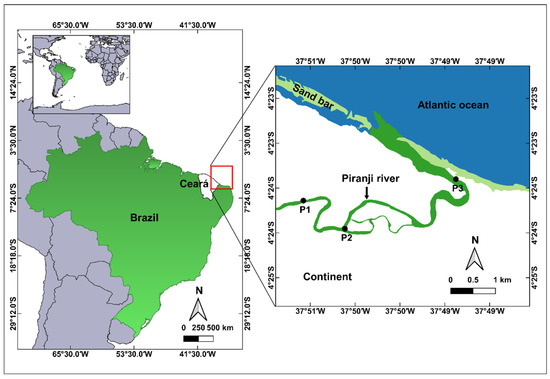 Piranji Estuary (equatorial Southwestern Atlantic, Brazil), and location of the P1–P3 sampling sites along the mangrove estuarine ecosystem during an intense drought period.