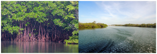 Piranji Estuary (equatorial Southwestern Atlantic, Brazil) with mangrove forests (left side) and the well-mixed shallow estuarine environment (right side).