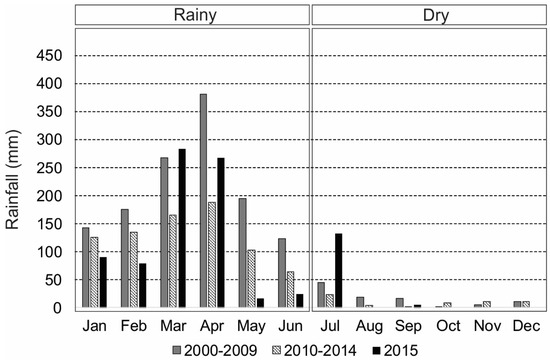 Mean precipitation (mm) of annual rainfall data (2000–2009), last drought cycle (2010–2014) [23] and collection date (2015) in Piranji Estuary (equatorial Southwestern Atlantic, Brazil) [32].