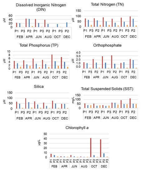 The estuary showed a low depth (3.4 ± 1.1 m) throughout the 2015 year, with stable values for temperature (27.5 ± 0.9 °C), pH (8.0 ± 0.4) and dissolved oxygen (5.6 ± 0.5 mg/L) (Table 1). An increasing gradient of nutrients was observed throughout the year from the downstream station (P3) to the upstream station (P1) (Figure 1). The downstream site (P3) was more stable and had low nutrient concentrations dominated by oligotrophic marine waters (Figure 4). Chlorophyll a varied spatially, with values decreasing from the point furthest upstream of the river (P1) to the point closest to the mouth (P3). A clear spatial variation during the year was observed at points 1 and 2, where chlorophyll a was initially very low, but then increased significantly in the driest months of October (P1 = 41.31 µg/L) and December (P1 = 38.60 µg/L) (Figure 4).