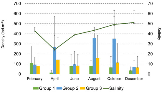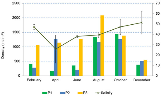 The lowest density (166.34 ind.m−3) was found in April (at P1) and the highest (2084.61 ind.m−3) in August (at P3) (Figure 5). In general, at the P1 and P2 upstream points, copepod density increased when salinity values increased; however, there was a reduction in density when the highest salinity levels occurred (Figure 5). Changes in abundance at P3 were observed only at the highest salinity level (Figure 5).