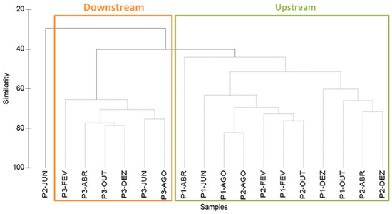 Cluster multivariate analysis revealed the formation of two groups (Figure 6). The first group clustered downstream samples from P3 (closest to the estuarine mouth), and the second group clustered samples from P1 and P2 (upstream region of the estuary). SIMPER analysis showed the contribution of copepod species to both groups. In the group downstream, the species that contributed the most were Parvocalanus crassirostris (26.65%), Parvocalanus cf. scotti (21.31%), and Oithona hebes (14.49%). In the group upstream, Oithona oswaldocruzi (51.71%), Parvocalanus crassirostris (10.28%), and Oithona hebes (10.17%) contributed the most.