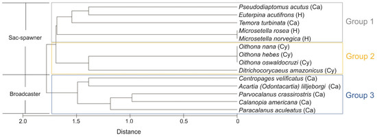 Two primary traits based on spawning strategy defined these functional groups, sac spawner (Group 1 and 2) and broadcaster (Group 3). The author of [66] mentioned that most pelagic copepods (mainly Calanoida) release their eggs freely into the sea or carry eggs in ovisacs attached to the genital segment, as is the case with other Copepoda orders. The latter method can be considered an adaptive advantage over co-occurring broadcast species [67,68]. This results in a sac spawner with comparatively low fecundity that is balanced by a higher abundance of specimens [69,69]. Female sac-spawner copepods have potentially higher mortality rates due to the presence of the ballast derived from their ovigerous sacs, which not only slows their movement but also acts as attractants for visual predators [70].