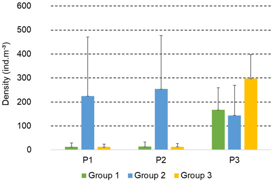 The mean abundance of groups ranged from 14.6 ± 23.6 ind.m−3 (Group 1—April) to 359.9 ± 48.5 ind.m−3 (Group 2). Group 1 consisted mainly of Euterpina acutifrons and Group 3 of Parvocalanus crassirostris. Group 2, characterized by the presence of stress-tolerant Oithona oswaldocruzi and O. hebes, had the highest abundance (Figure 8) throughout the year. The closer to the estuarine mouth, the greater the abundance of Groups 1 and 3 (P1 < P2 < P3). By contrast, the abundance of Group 2 was higher at the upstream stations (P2 > P1 > P3) (Figure 9).