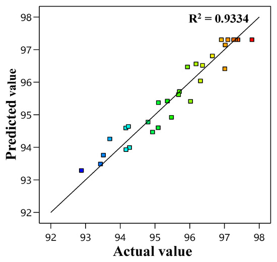 In Table 4, the percentage of actual and predicted values of MB removal are presented. The fundamental purpose of using regression models is to determine the model’s ability to predict the response variable. Figure 1 illustrates that the predicted value of MB adsorption is plotted against the actual value from data, yielding an R2 value of 0.9334 (Table 7), which validates the models’ accuracy and can be used in the experiment.