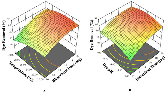 The primary justification for using biomass in industrial applications is its availability and low cost [49]. Agricultural waste is frequently recognized as a promising biosorbent. To get rid of MB, dried J. regia shell biomass was employed as a biosorbent. Figure 3A–C show how the effect of the biosorbent dose interacts with three other independent factors. It has been noted that as the amount of biosorbent is increased from 10 to 20 mg, dye removal increases at every range of temperature, pH, and concentration values (Figure 3A–C, respectively). The biosorption of MB dye was limited at the lowest biomass content. The concentration of J. regia shell biomass increases the biosorption of MB dye from an aqueous solution [50]. The biosorption of MB dye by J. regia shell was reduced after obtaining the optimal biomass content. More biosorption sites are available due to the J. regia shell biomass’s increased surface area, which leads to effective biosorption [51]. When the biomass levels are low, the active regions are more effectively utilized. El Hassouni et al. assume that the decrease in biosorption process efficiency with increased biomass concentration is caused by an increase in the number of unsaturated active adsorption sites on the biosorbent surface as well as a lack of readily available metal ions in the solution to bind with all the available binding sites [52].