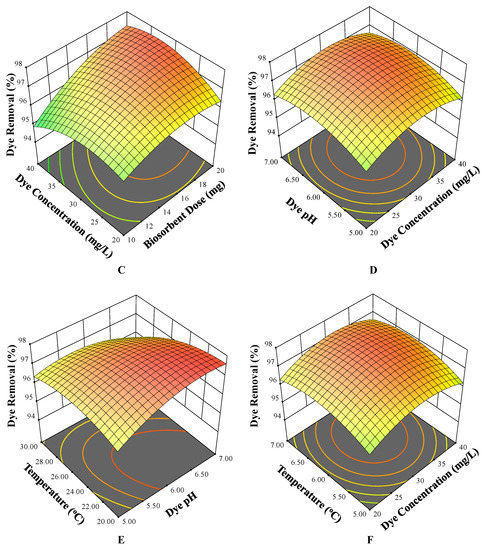The associations between the dependent variables (MB dye removal) and the interaction between the four selected independent variables were represented using three-dimensional surface plots to assess the variation in the response values and to select the ideal level of process parameters for the most effective MB dye removal from aqueous solutions. The effect of dye solution temperature with three other independent variables is illustrated in Figure 3A,E,F. Dye removal remained unaffected by temperature, as shown in Figure 3A,F. However, at a higher value of pH, a slight decrease in dye removal was seen with increasing temperature from 20 to 30 °C (Figure 3E).