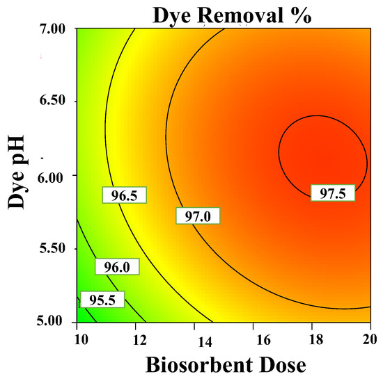 The primary factor influencing the pollutant biosorption process has been found to be the initial pH level. The activity of the functional groups of biomasses, the chemistry of the dye solution, and the net charge on the biosorbent cell surface are all affected by pH level [47]. Figure 3B,D,E show how the initial dye pH affects three other independent variables. According to Figure 3B, dye removal increases as pH rises from 5 to 7 at a lower range of biosorbent doses. However, pH had no impact on dye removal at lower biosorbent doses (Figure 3B) or at every range of initial dye concentration (Figure 3D). Additionally, it has been noted that dye removal was reduced when pH was raised at a higher range of temperature values but unaffected at a lower range of temperature values (Figure 3E). According to the results of this study, increasing the pH improves the biosorption of MB dye by J. regia shell biomass, with the highest biosorption occurring at around pH 7 (Figure 4). The protonation and deprotonation of the MB dye as well as the surface of the J. regia shell working as a biosorbent may have contributed to the observed outcome. Dye adsorption on the surface of biomass is regulated by ionic attraction [48]. The electrostatic forces between the MB dyes and the surface charge of J. regia shell particles can adequately explain the differences in adsorption behaviour under different pH values.