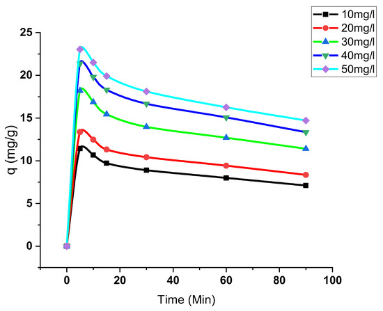 3.3.3. Effect of Initial Concentration and Contact Time
