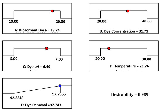The best-predicted possibility for the highest response was estimated using the desirability function [53]. For the optimization procedure, the desirability function was used. The desirability function values varied from 0 (undesirable) to 1 (desirable). The numerical optimization method finds the points that maximize the desired function. The best-predicted values for the maximum removal percentage of MB and the desirability function are shown in the optimization plot in Figure 6. The optimal projected condition for the optimal removal percentage of MB using the desirability function was a biosorbent dose of 18.2 gm, a dye pH of 6.4, a dye concentration of 31.7 mg/L, a temperature of 21.7 °C, and a dye removal of 97.74%.