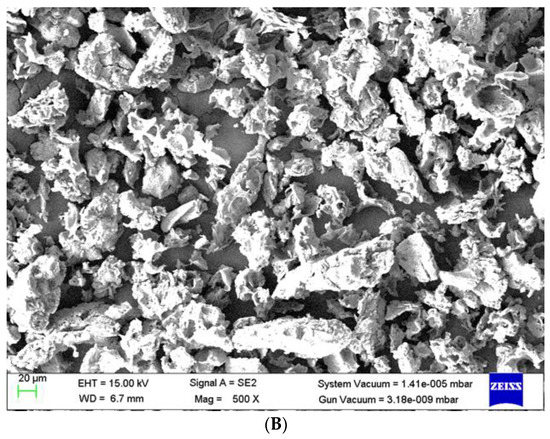 SEM graph of Juglans regia shell biomass: (A) before and (B) after MB biosorption.