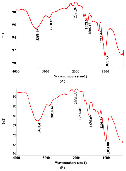 The J. regia shell surface was examined before and after MB dye biosorption to detect any changes in the surface features using FTIR spectroscopy, which was also used to improve the chemical’s properties and to determine the presence of functional groups. The frequency of vibration in a J. regia shell was monitored using FTIR spectroscopy often [54]. Each spectrum was collected between wavenumbers 4000 and 400 cm−1. The significant peaks of raw J. regia shells in the functional group area, as seen in Figure 8A, occurred at 3353, 2900, and 1606 cm−1. The band at 1729 cm−1 is created by the carbonyl group being stretched in the C = O direction, whilst the band at 1633 cm−1 may be generated by either the C = C stretching of an alkene or the N-H bending of an amine.