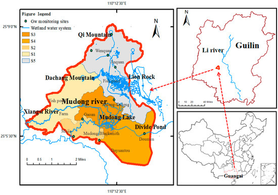 The study area was the Mudong River watershed of the Huixian Wetland in the Li River basin (Figure 1). After the field survey, the Mudong River watershed has a fixed head boundary and a fixed flow boundary for which the source and sink can be calculated. The water balance is in a positive equilibrium state, which is typical for a karst-closed sub-basin. The rainfall is abundant and concentrated in April–September. The average annual temperature is 21 °C. The longest dimension is from east to west (7.71 km), the width from north to south is 8.36 km, and the area is about 31.09 km2.