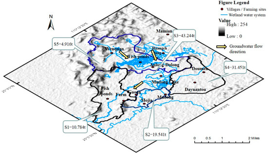 The average concentration of total phosphorus in the shallow groundwater of the Mudong River watershed was 0.07 mg/L. The migration process was extremely insignificant in months with low rainfall. Nitrogen pollution from agricultural fields has become one of the most important sources of pollution in agricultural environments [16]. Nitrogen pollutants are easily adsorbed by particulate matter (sediment or colloid), which can reflect the effect of fertilization in the watershed. Therefore, the larger average concentration of total nitrogen (7.69 mg/L) was used as the transport component. The calculations showed that the monthly average emissions of total nitrogen pollution load in the S3 and S4 sub-basins in 2019 were 43.244 t and 31.451 t, respectively (Figure 2). Our preliminary finding is that the S3 and S4 sub-basins are high pollution risk areas for nitrogen pollution in the Mudong River watershed, contributing 67.94% of the total nitrogen pollution in the Mudong River watershed.