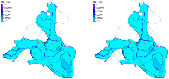 The MT3DMS module was applied to solve the total groundwater nitrogen transport according to the three scenarios set in Table 3. The status quo year model M1 was calibrated to simulate a stress period from January 2020 to December 2020. Its simulation results for 123 d (fertilization at the tilling stage of early rice) and 245 d (fertilization at the end of late rice transplanting) are shown in Figure 4.