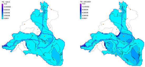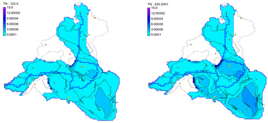 Total nitrogen simulation results at 123 d and 245 d of the current year model. Note: The blanks in the figure are karst solitary peaks/peak cluster depressions, and the aquifer is drained, so the model cannot display the simulation results.