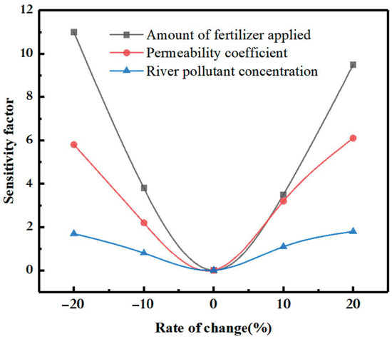 Shallow groundwater solute transport models were constructed based on the three scenarios. Sensitivity analysis was used to assess the effects of the scenarios on total nitrogen transport. This approach is based on the principle of using the model output results to find the bias of the input model scenario parameters and using the magnitude of the bias to determine the magnitude of the influence of the input model scenario parameters on the model output results (Equation (6), which can be rewritten as Equation (7) for the convenience of calculation).