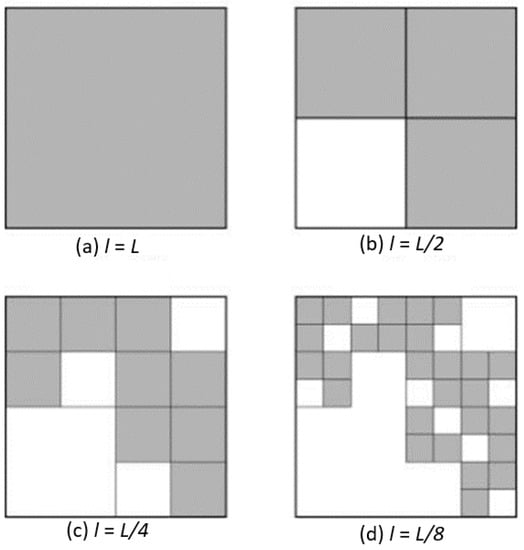 A fractal pattern is characterized by the so-called fractal dimension, , that is generally not an integer and smaller than the corresponding Euclidean (topological) dimension of the space, D. There are different ways to determine fractal dimensions in practice. One straightforward definition of the fractal dimension is called “box” dimension that is determined by counting the number (N) of box, as a function of box size (l), required to cover the fractal pattern: