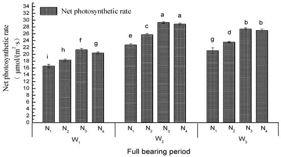 Effects of different water and nitrogen treatments on the net photosynthetic rate at full fruit-bearing stage. Note: if there are the same lowercase letters on the bars, this indicates that there is no significant difference among treatments at the 0.05 level. W1, 0.75 actual evapotranspiration (ETc); W2, 1.00 ETc; W3, 1.25 ETc. N1 (120 N hm−2), N2 (220 N hm−2), N3 (320 kg N hm−2), N4 (420 kg N hm−2).