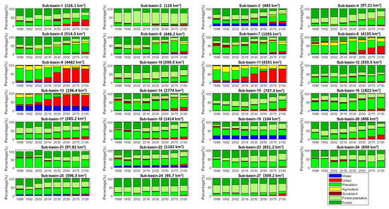 Changes in LULC significantly alter the hydrological characteristics of the local region. Thus, it is important to study the changes in LULC at the sub-watershed scale in correlation with changes in variation in local hydrology. The PRW watershed is divided into 27 sub-watersheds based on topography. The variation in the LULC for each sub-watershed from 1988 to 2100 is represented in Figure 3. It can be noticed that in 1988, the urban concentration was limited to a few sub-watersheds, including sub-watersheds 8, 9, and 13.