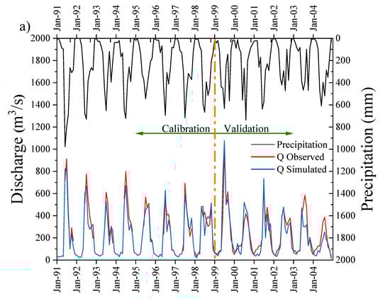 The goodness of fit was tested using the coefficient of determination (R2), Nash–Sutcliffe efficiency (NSE) [55], percent bias (PBIAS) [56], and RMSE-observations-to-standard-deviation ratio (RSR) [57]. Streamflow calibration efforts achieved an R2 and NSE of 0.86 and 0.81 during the calibration period (1991–1998), and 0.84 and 0.80 during the validation period (1999–2004), respectively. Additionally, PBIAS and RSR values were +6.5% and 0.38 for the calibration period (1991–1998) and +8.7% and 0.46 for the validation period (1999–2004), respectively. Although the observed streamflow data for the dry season (December through May) were unavailable for comparison with the simulated outputs from 1991 to 1998, they showed a good correlation in later years (Figure 4a).