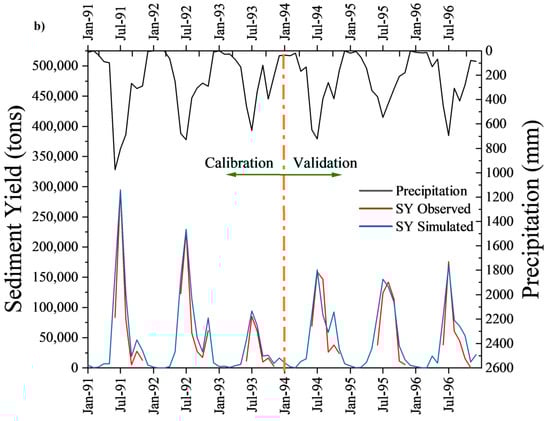 Calibration and validation for (a) streamflow (1991–2004) and (b) sediment yield (1991–1996) at Neeleshwaram gauging station of PRW. Note: the streamflow data during the dry months (December through May) were not available for 1991–1998.
