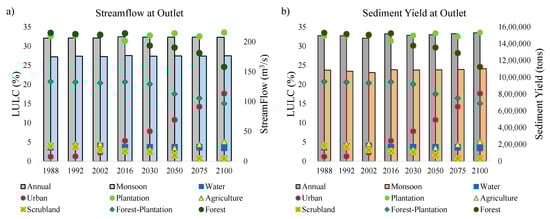 The calibrated PRW SWAT model was executed with varying LULC scenarios to analyze the effects of LULC change on flow and sediment yield. Table 3 and Figure 5 show the annual and monsoon seasonal variation in SF and SY due to changes in LULC between 1988 and 2100. The year 1988 was selected as a baseline for which the average annual streamflow at the outlet was 206.21 m3/s. The results are depicted in Table 3 and Figure 5. There was no significant change in streamflow at the watershed outlet; only a minimal effect was observed, which ranged from an increase of 0.05% to 2.0% from the baseline between all LULC scenarios.