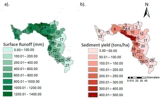 Spatial distribution of average annual (a) surface runoff and (b) sediment yield at sub-watershed (#1 to #27) for the period 1991–2004 with LULC 1988 (baseline). (Here, # indicates the sub-watershed ID.)