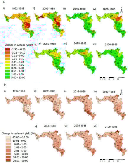 Spatial variation of change (%) in the (a) surface runoff and (b) sediment yield at sub-watershed outlet with varying LULC between 1988 and 2100 across the sub-watersheds (#1 to #27): (i) 1992-1988; (ii) 2002-1988; (iii) 2016-1988; (iv) 2030-1988; (v) 2050-1988; (vi) 2075-1988; and (vii) 2100-1988.