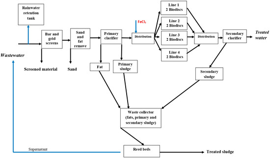 From the secondary clarifier, the treated water is discharged into the Hartibaciu River, while the resulting wet sludge is pumped onto the sludge-reed (genus Phragmites) beds, a simple and cost-effective dehydration process (air-drying) [41]. Reeds have an active growth and use the sludge nutrients and water; the resulting biomass is harvested every year and used for composting.