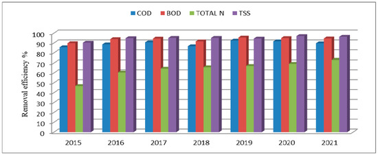 The data for the years 2015–2021 are presented in Supplementary Material S2; the removal efficiency is shown in Figure 3.