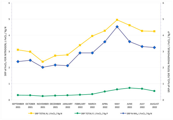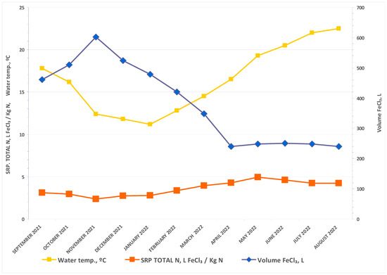 Knowing the temperature and the inflow parameters (volume and pollutant concentration), the total daily load is calculated, and the operator can easily determine the volume of 40% FeCl3 solution to be used for the next 24 h. This is performed manually at this moment, taking into account the diagram in Figure 8 and the season. For instance, if the water temperature is 15 °C in autumn, the SRP is 2.8 L 40% ferric chloride for 1 kg of total nitrogen, but in spring, for the same temperature, the SRP is 4 L/kg total N (i.e., for the same nitrogen load a smaller volume of FeCl3 is required).